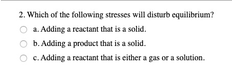 Solved Which Of Thc Following Stresses Will Disturb Equilibrium Adding Reactant That Is Solid Adding Product That Is Solid Adding Rcactant That Is Cither Gas Or Solution