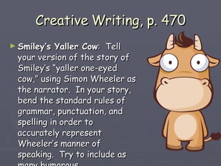 I have to eat. Simon Wheeler narrates the inside story and he uses an uneducated vernacular to tell his tall tales about Smiley and Danl Webster helping in the development of the story. References Staff writer 2007-08-31.